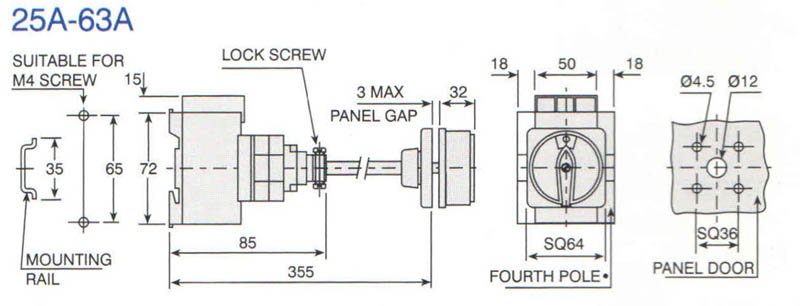 Two hole or snap mounting on DIN rail (35mm) and operable from the front (door) coupled with door mechanism,?Door interlock ( door can only open in OFF position), Round Padlockable device to prevent operation by unauthorized personnel, Degree of Protection : IP65. Lenght of the shaft supplied :10″ ?250mm, Adjustable mounting by cutting the metal shaft to correct length for panel height