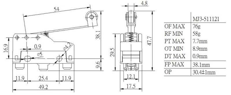 MOUJEN MJ3-511121 Extended Hinge Roller Lever Micro Switch Positive Opening